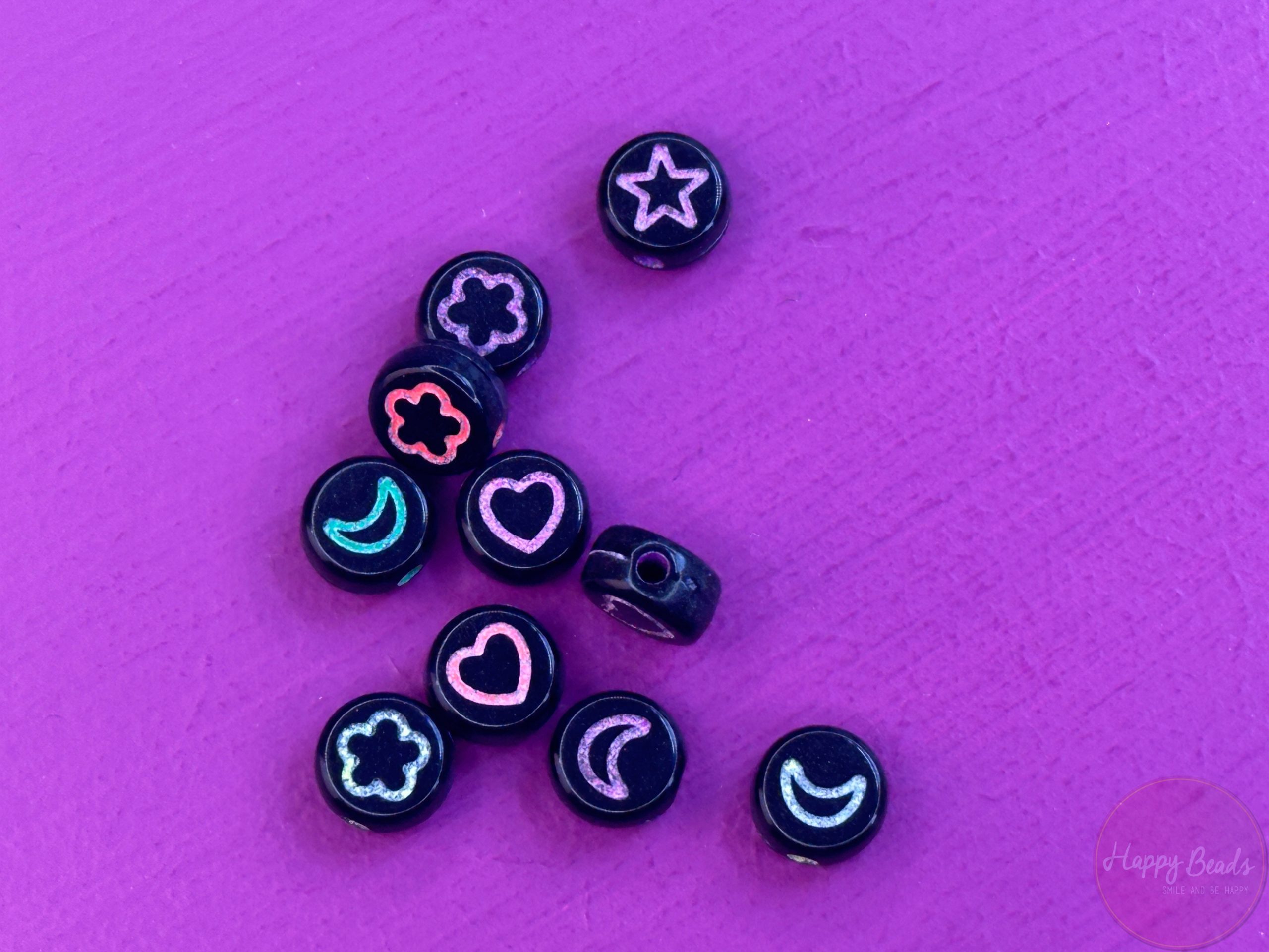 Kleur: zwart met gekleurde afbeelding zon, maan, bloem, ster, hart